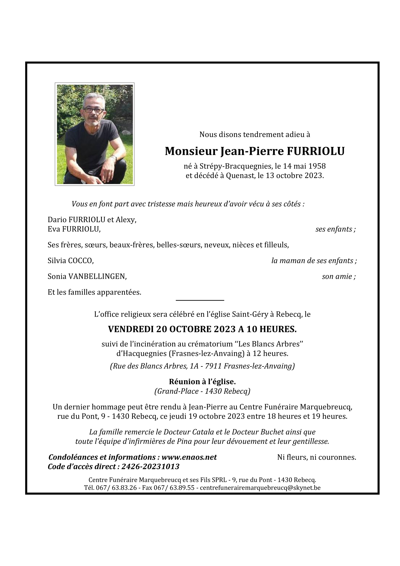 Décédé à Quenast (1430) le vendredi 13 octobre 2023 à l'âge de 65 ans