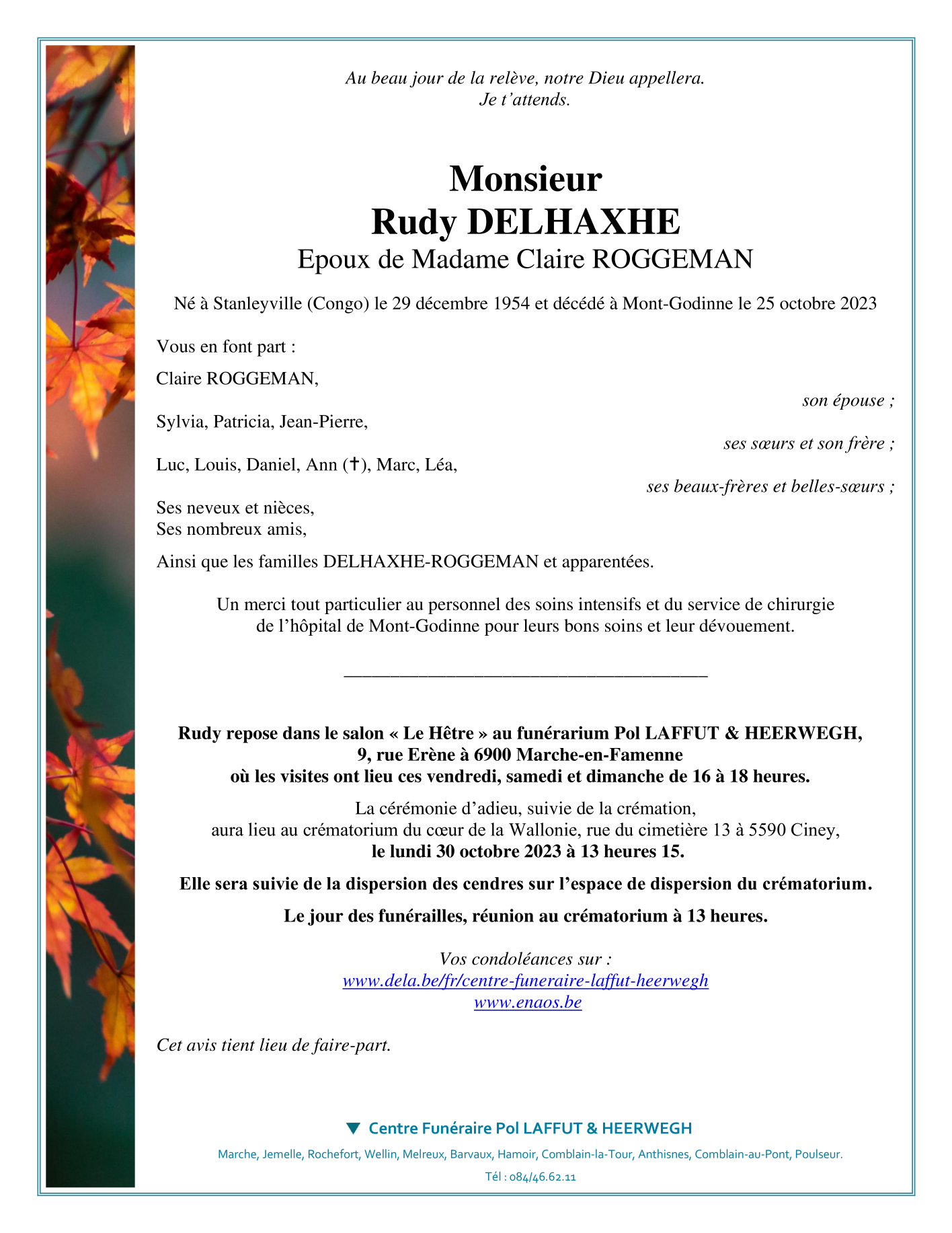 Décédé à Yvoir (5530) le jeudi 26 octobre 2023 à l'âge de 68 ans