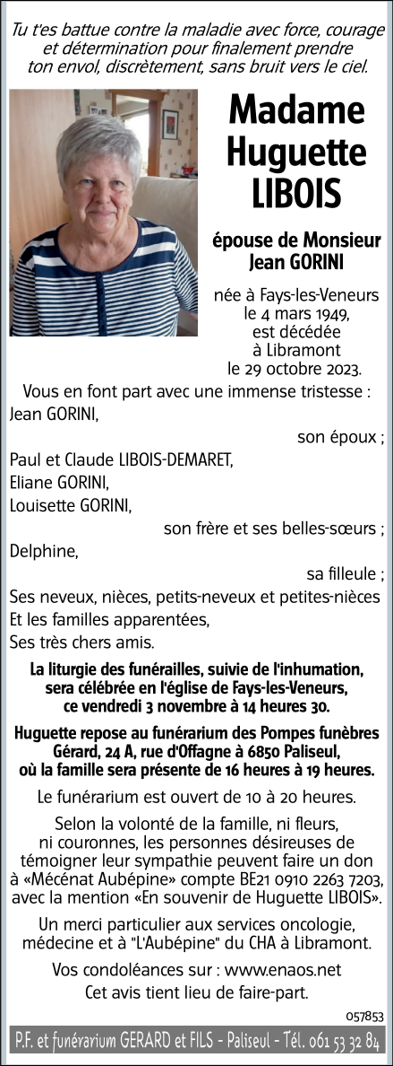 Décédée à Libramont (6800) le lundi 30 octobre 2023 à l'âge de 74 ans