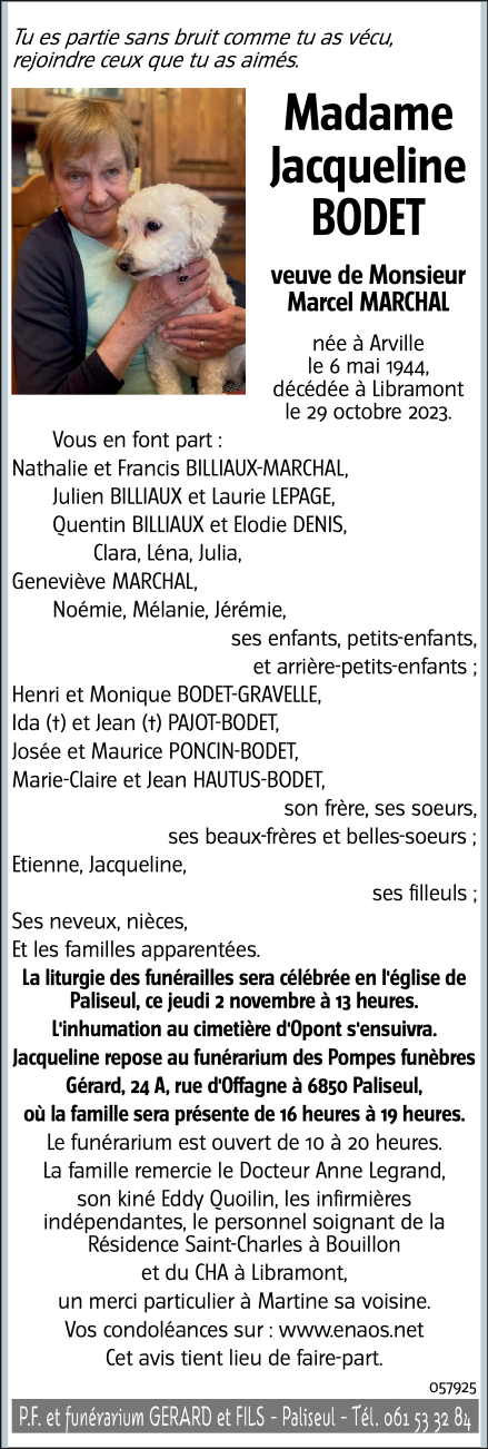 Décédée à Libramont (6800) le lundi 30 octobre 2023 à l'âge de 79 ans