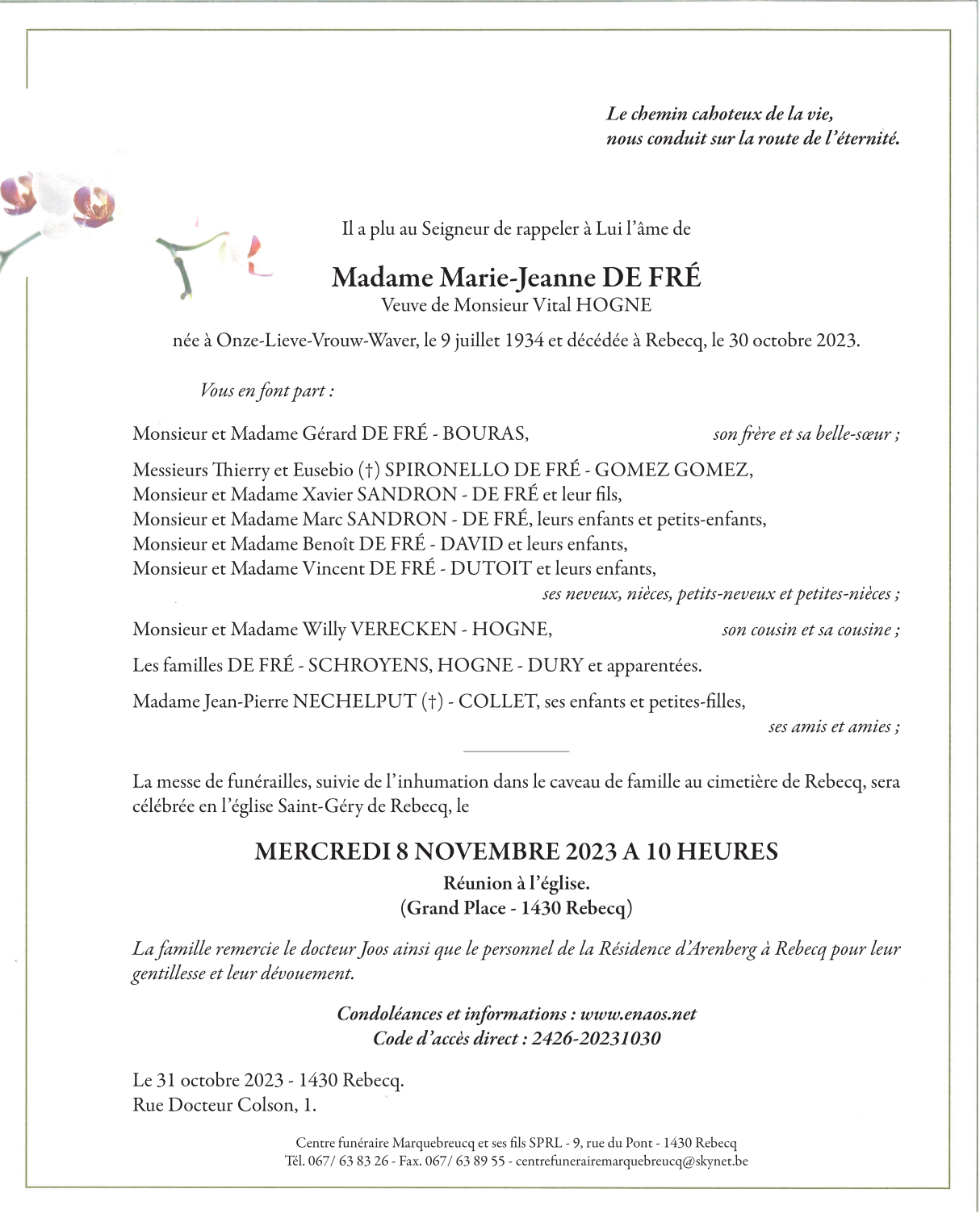 Décédée à Rebecq (1430) le lundi 30 octobre 2023 à l'âge de 89 ans