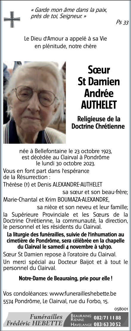 Fallecida en Pondrôme (5574) el lunes, 30 de octubre de 2023 a la edad de 100 años