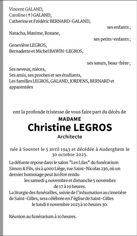 Décédée à Auderghem (1160) le lundi 30 octobre 2023 à l'âge de 80 ans