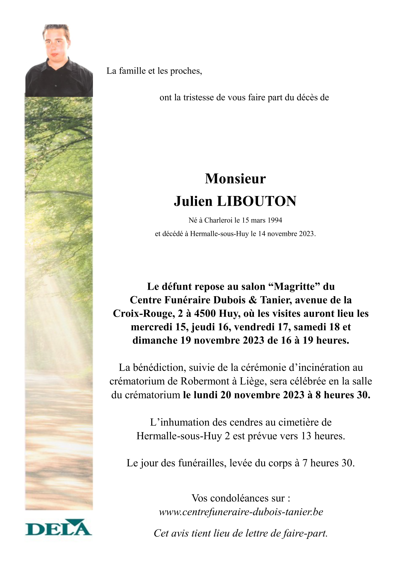 Décédé à Hermalle-sous-Huy (4480) le mardi 14 novembre 2023 à l'âge de 29 ans