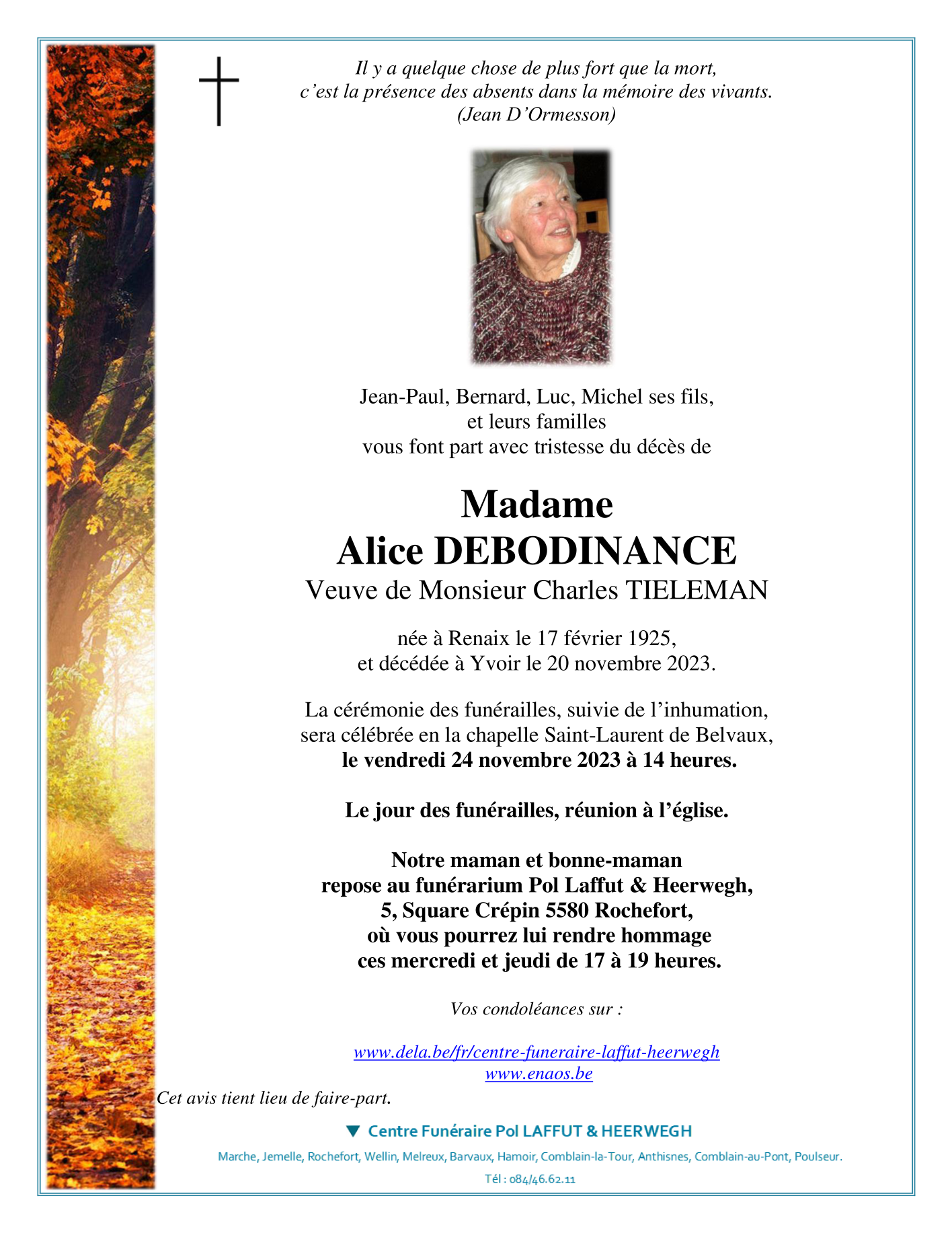 Décédée à Yvoir (5530) le lundi 20 novembre 2023 à l'âge de 98 ans
