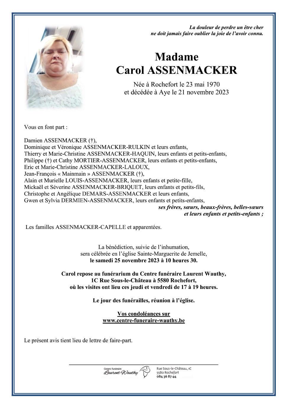 Décédée à Aye (6900) le mardi 21 novembre 2023 à l'âge de 53 ans