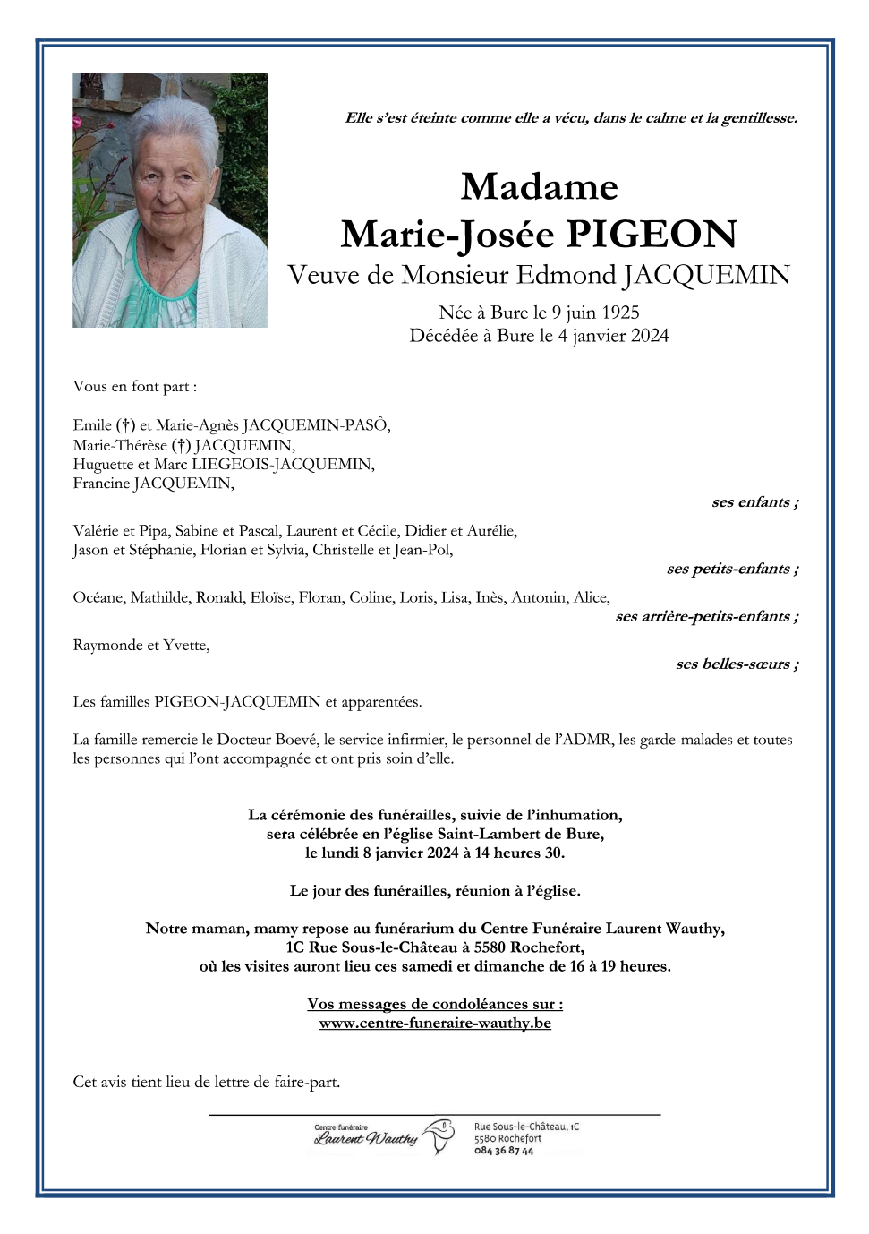 Fallecida en Bure (6927) el jueves, 4 de enero de 2024 a la edad de 98 años