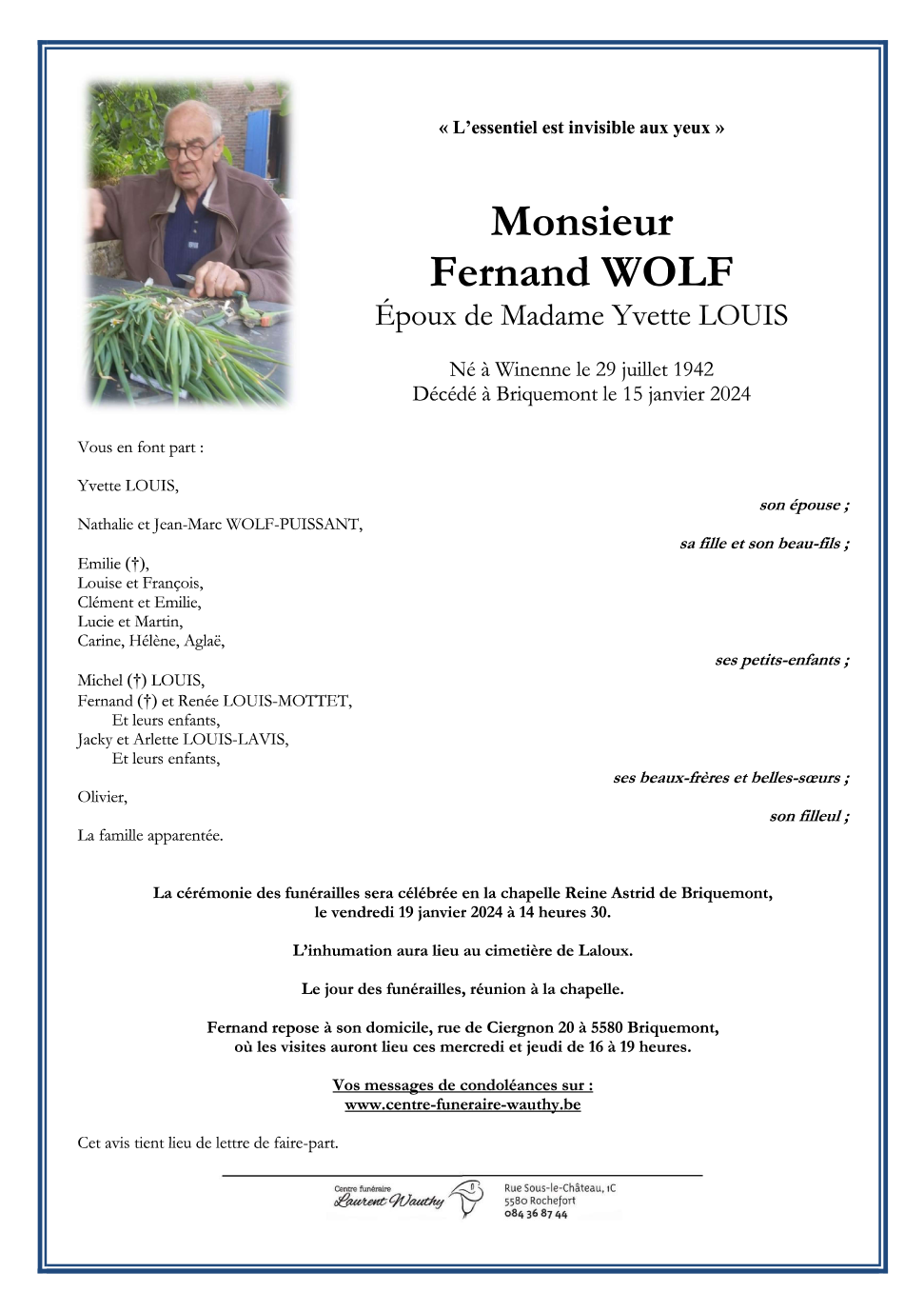 Décédé à Briquemont (5580) le lundi 15 janvier 2024 à l'âge de 81 ans