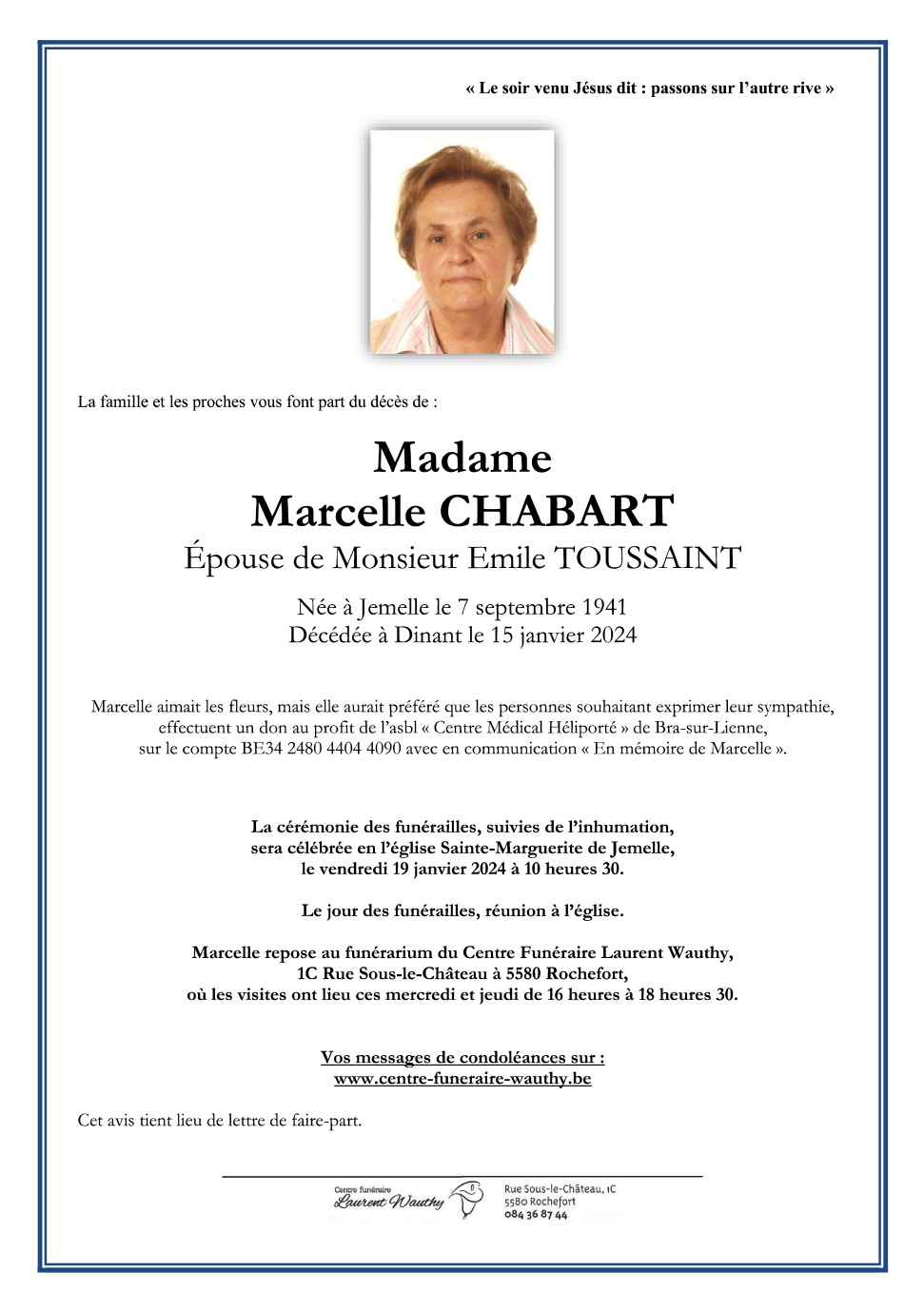 Décédée à Dinant (5500) le lundi 15 janvier 2024 à l'âge de 82 ans