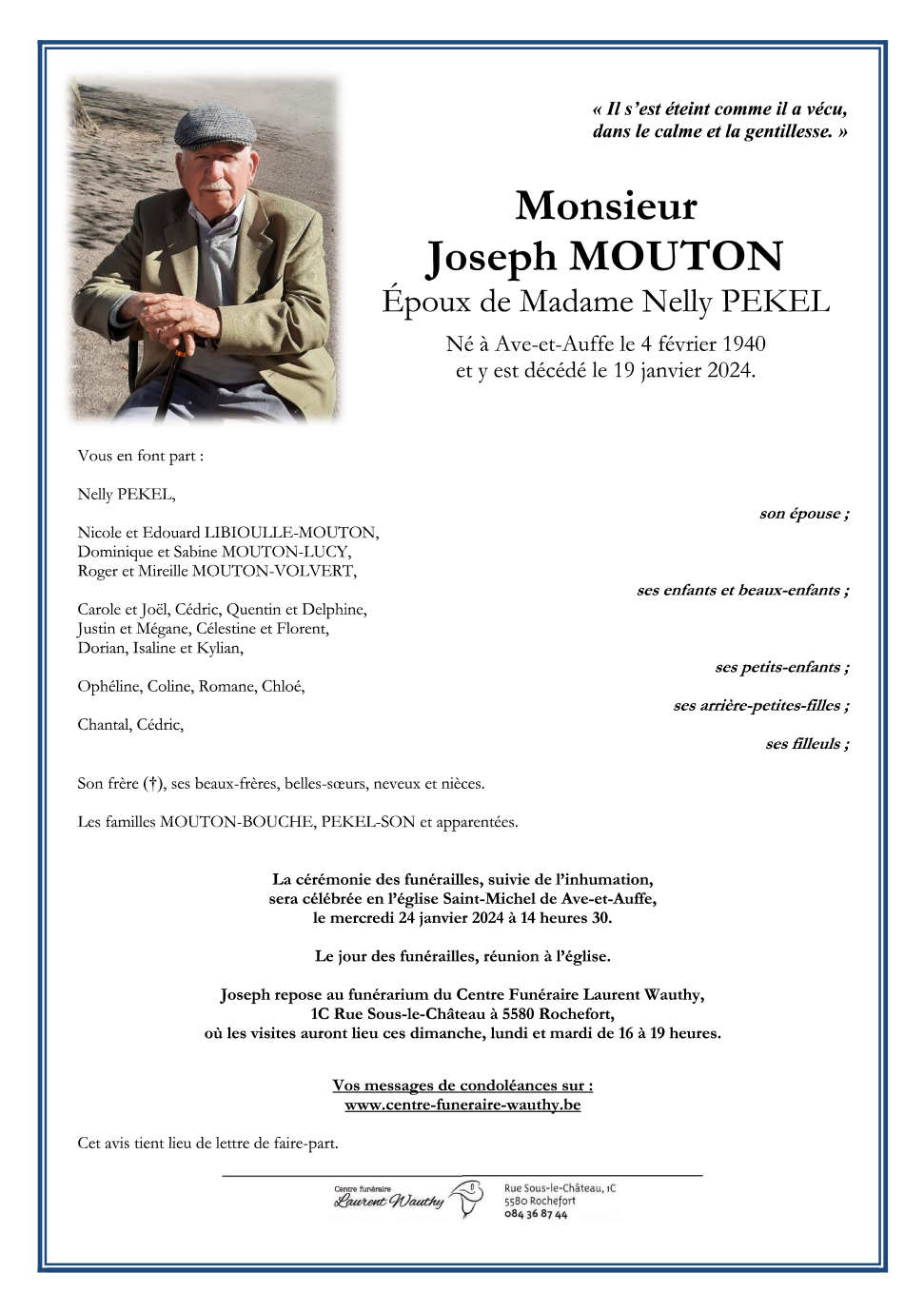 Décédé à Ave-et-Auffe (5580) le vendredi 19 janvier 2024 à l'âge de 83 ans