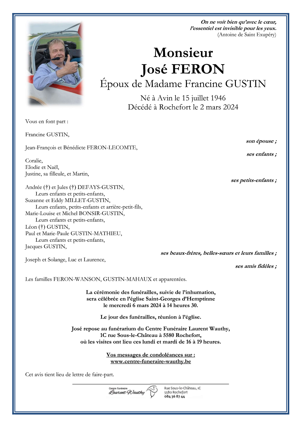 Décédé à Rochefort (5580) le samedi 2 mars 2024 à l'âge de 77 ans