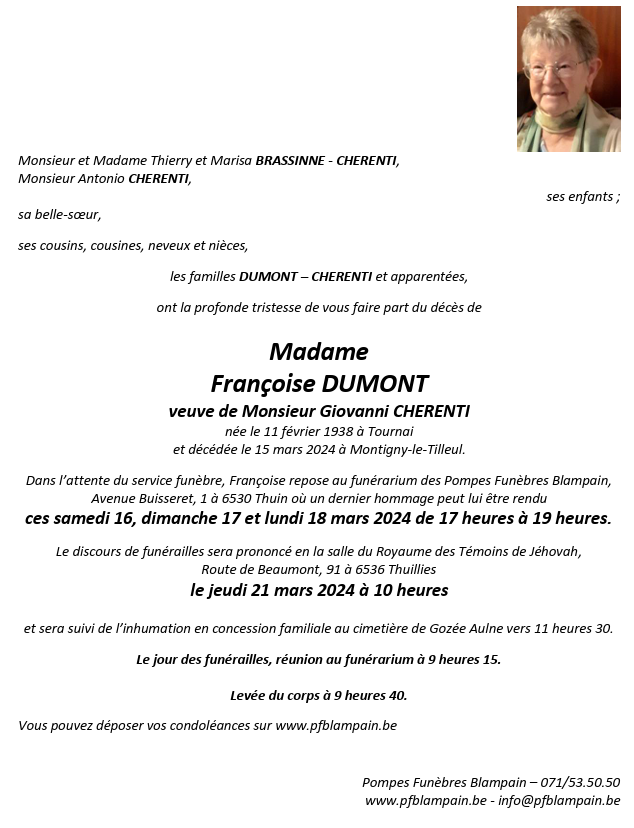 Décédée à Montigny-le-Tilleul (6110) le vendredi 15 mars 2024 à l'âge de 86 ans