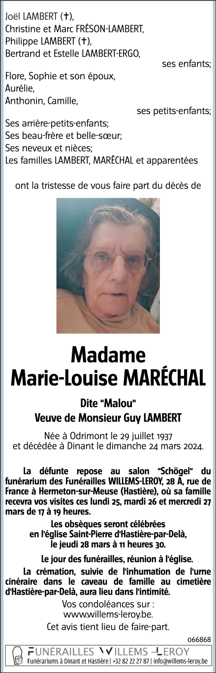 Décédé à Dinant (5500) le dimanche 24 mars 2024 à l'âge de 86 ans