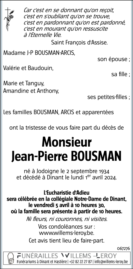 Décédé à Dinant (5500) le lundi 1 avril 2024 à l'âge de 89 ans