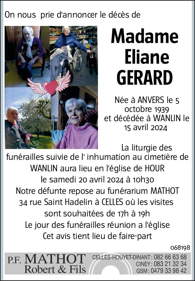 Décédée à Wanlin (5564) le lundi 15 avril 2024 à l'âge de 84 ans
