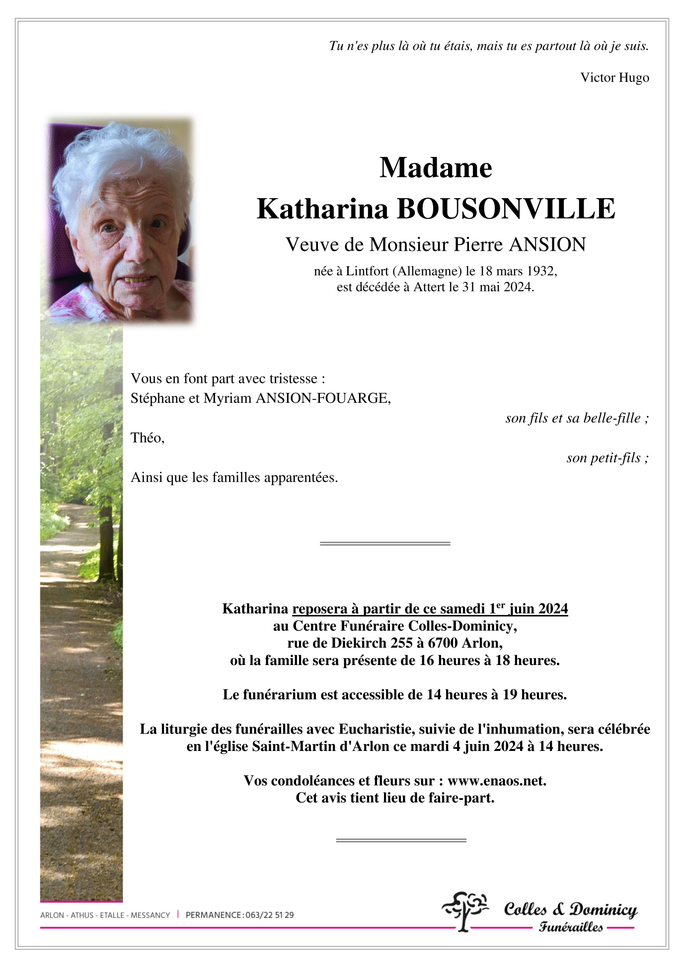 Décédée à Attert (6717) le vendredi 31 mai 2024 à l'âge de 92 ans