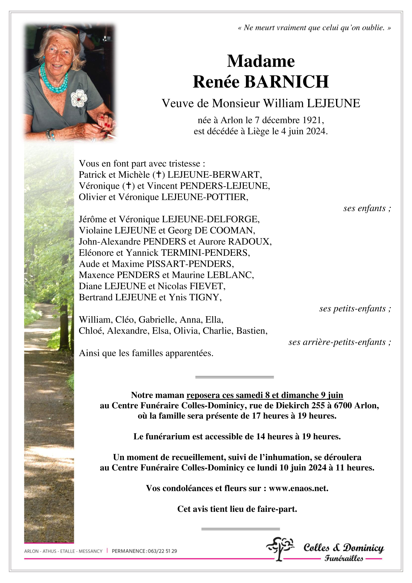 Fallecida en Liège (4000) el martes, 4 de junio de 2024 a la edad de 102 años