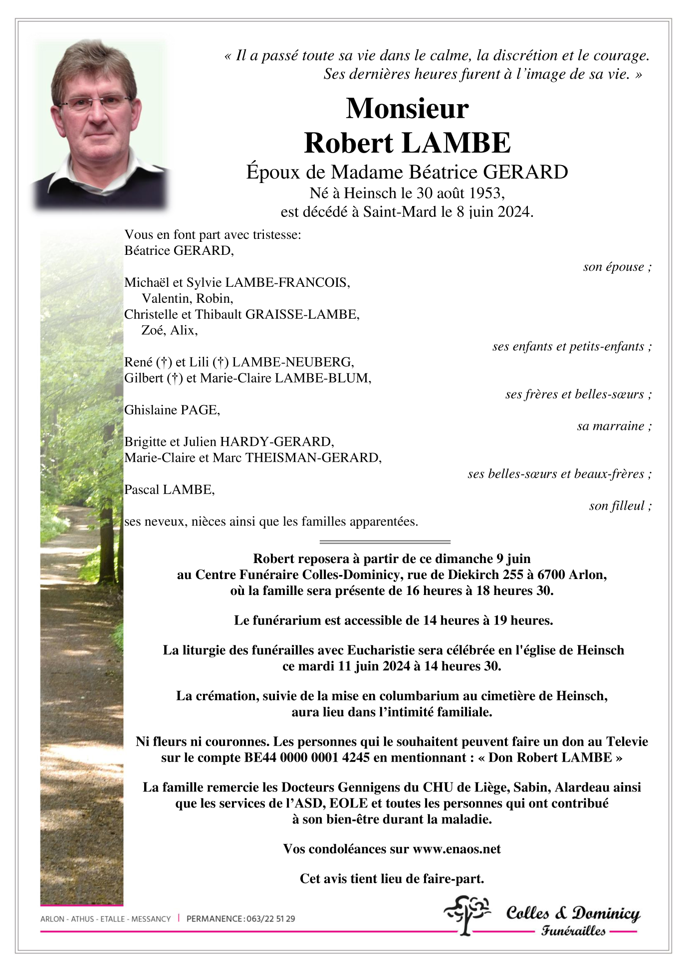 Overleden te Saint-Mard (6762) op zaterdag 8 juni 2024 op 70-jarige leeftijd
