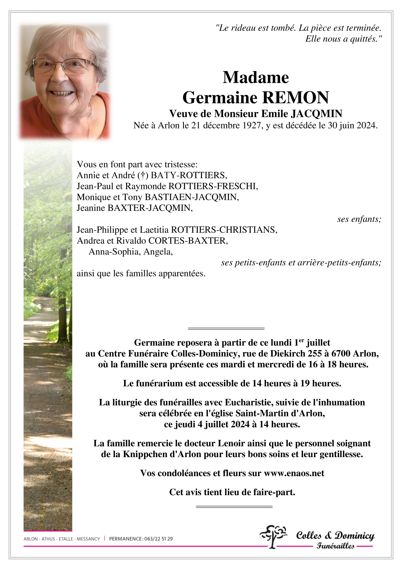 Fallecida en Arlon (6700) el domingo, 30 de junio de 2024 a la edad de 96 años