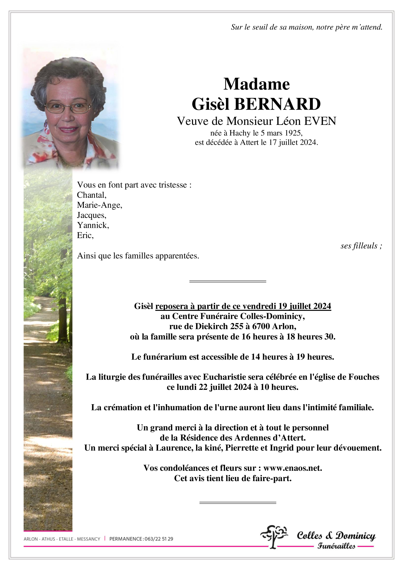 Décédée à Attert (6717) le mercredi 17 juillet 2024 à l'âge de 99 ans