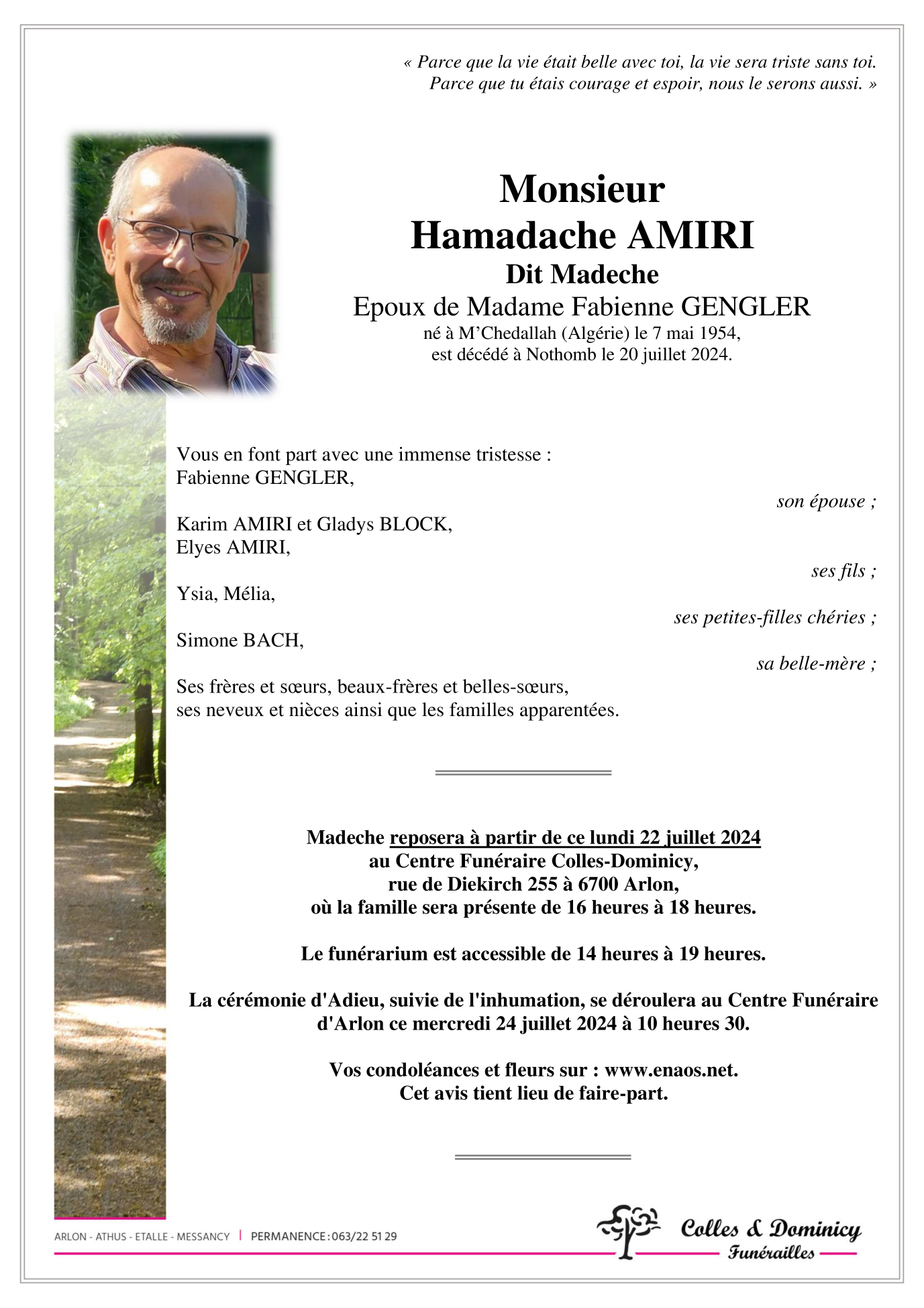 Décédé à Nothomb (6717) le samedi 20 juillet 2024 à l'âge de 70 ans