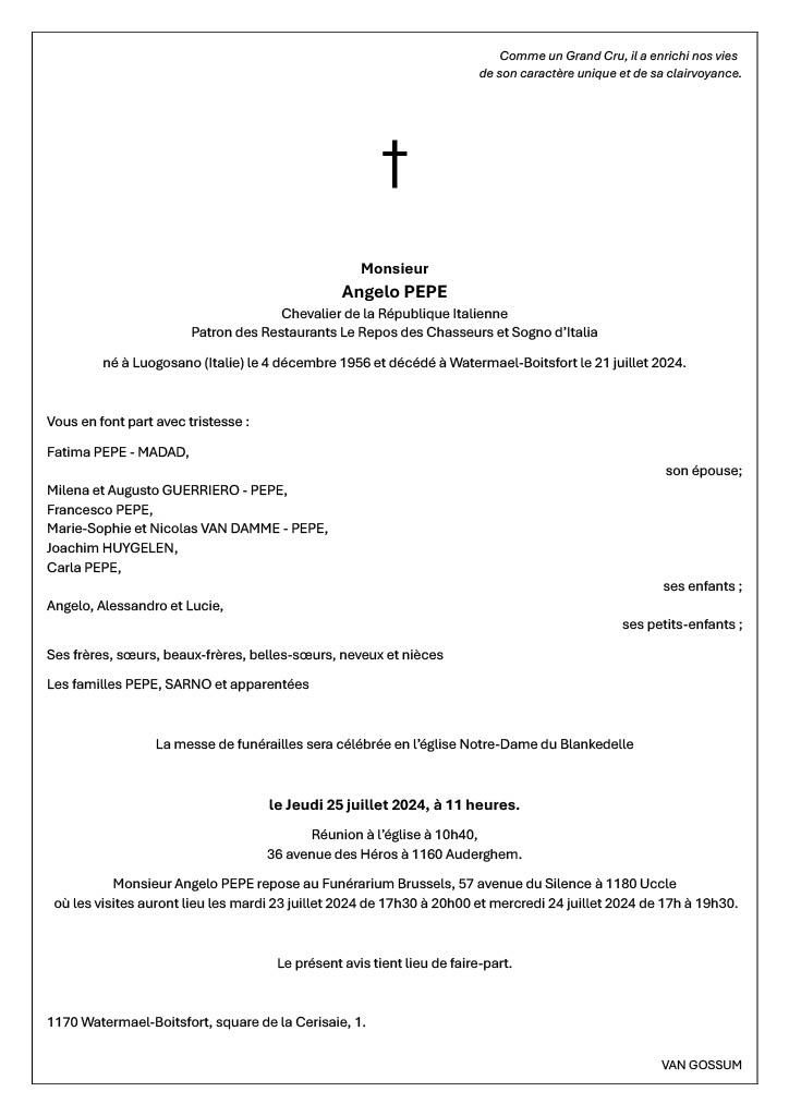 Décédé à Brussel (Watermaal-Bosvoorde) (1170) le dimanche 21 juillet 2024 à l'âge de 67 ans