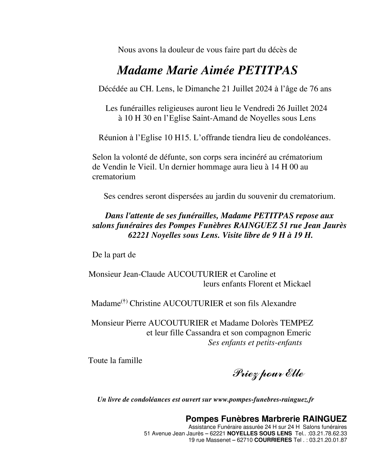 Fallecida en Lens (62300, Francia) el domingo, 21 de julio de 2024 a la edad de 76 años