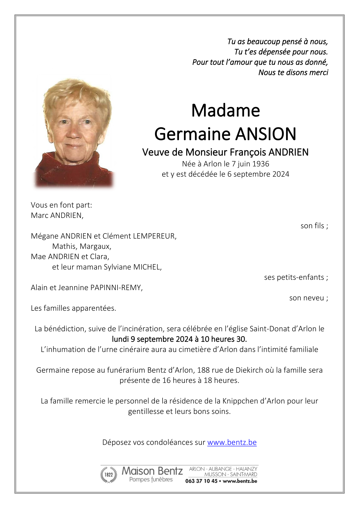 Décédée à Arlon (6700) le vendredi 6 septembre 2024 à l'âge de 88 ans
