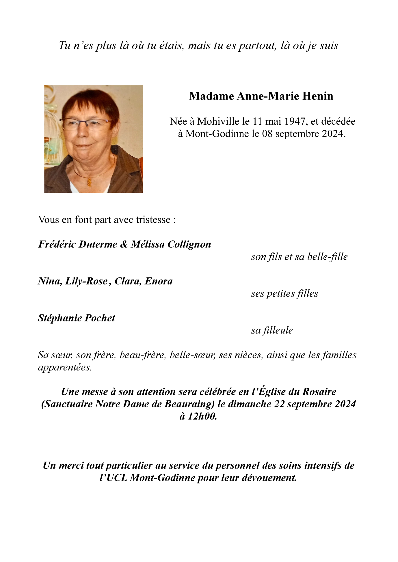 Died in Mont-Godinne (5530) on 08 September 2024 at the age of 77 years