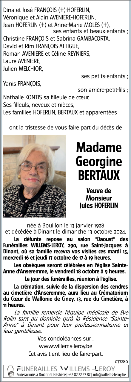 Décédée à Dinant (5500) le dimanche 13 octobre 2024 à l'âge de 96 ans