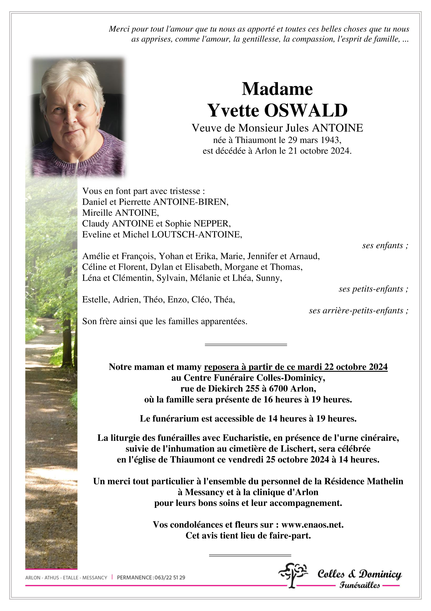 Décédée à Arlon (6700) le lundi 21 octobre 2024 à l'âge de 81 ans