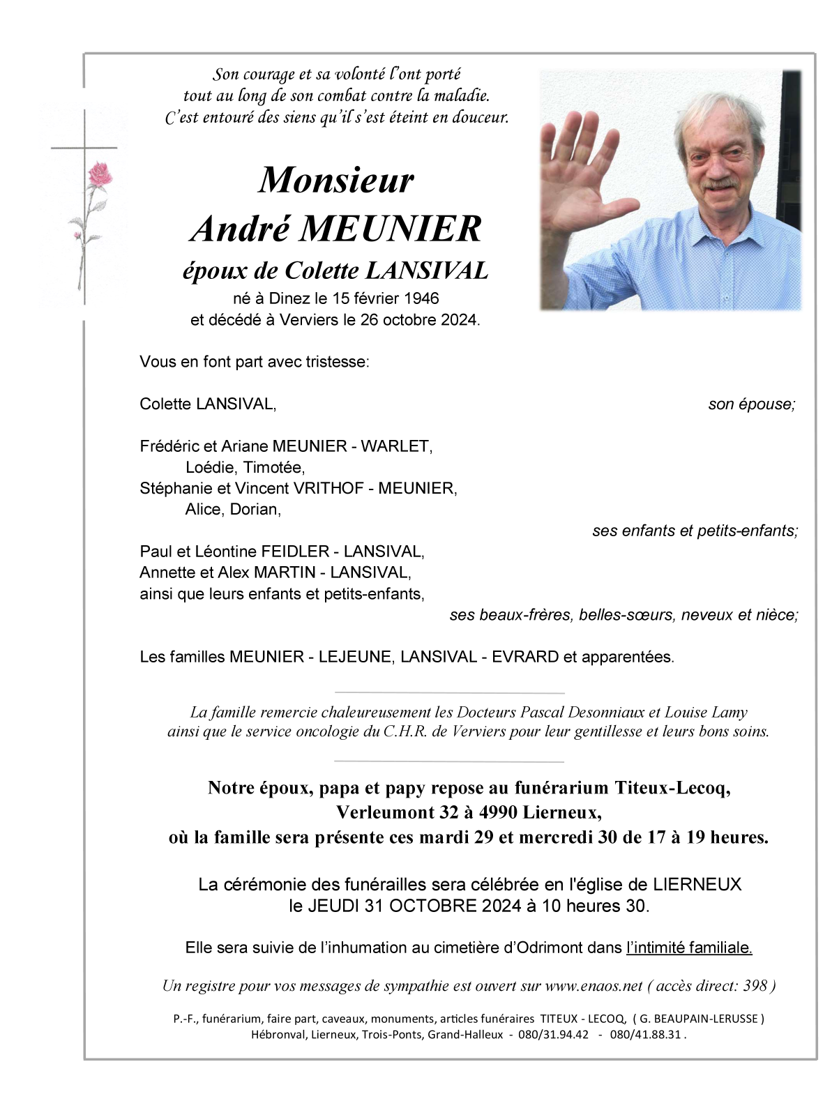 Décédé à Verviers (4800) le samedi 26 octobre 2024 à l'âge de 78 ans