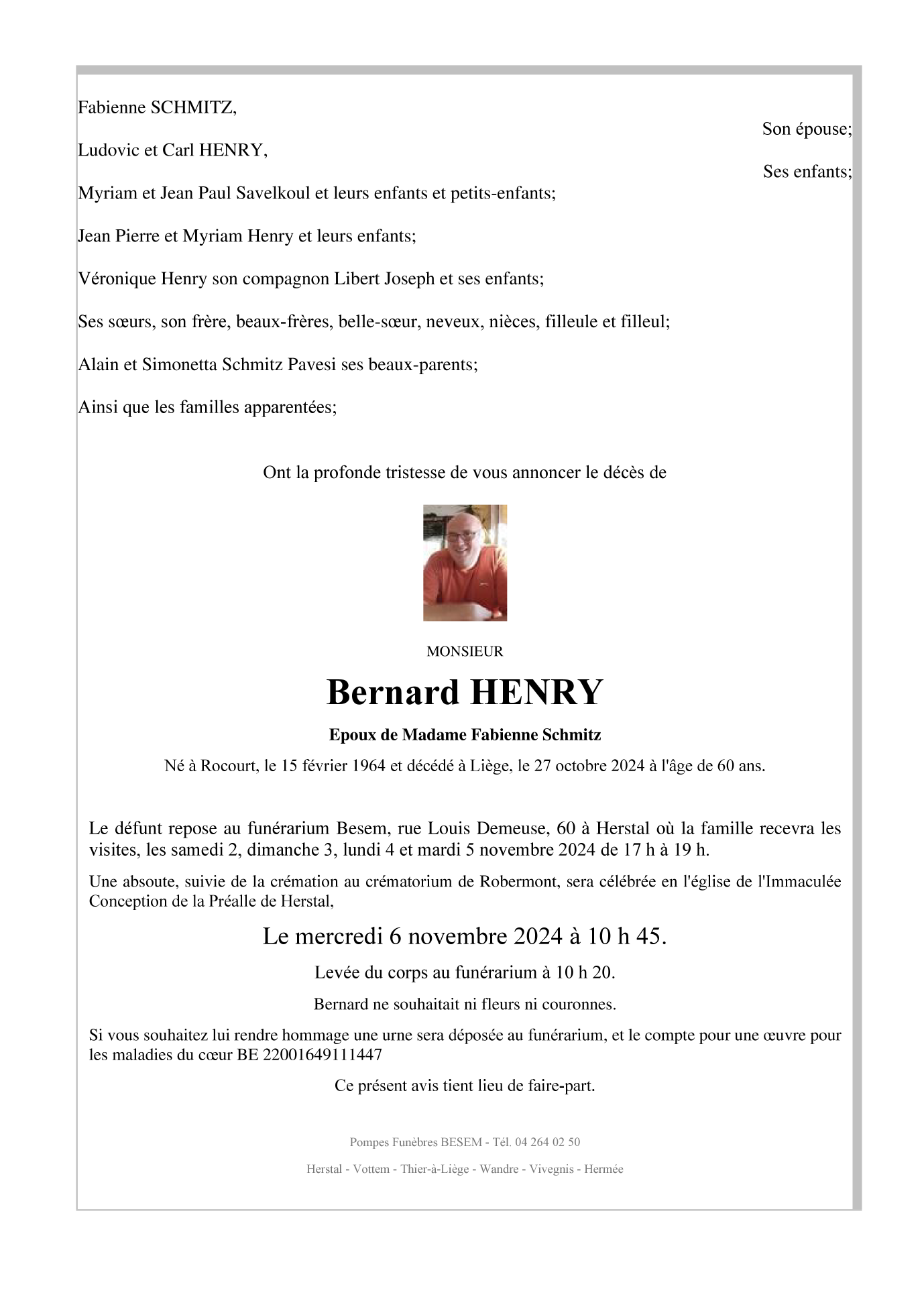 Décédé à Liège (4000) le dimanche 27 octobre 2024 à l'âge de 60 ans