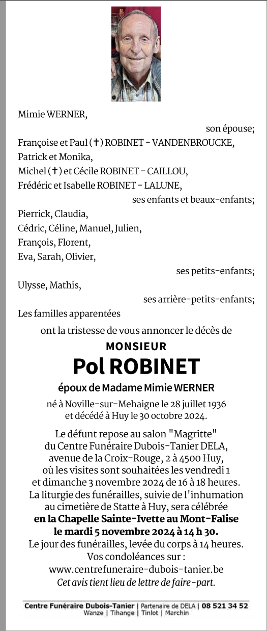 Décédé à Huy (4500) le mercredi 30 octobre 2024 à l'âge de 88 ans