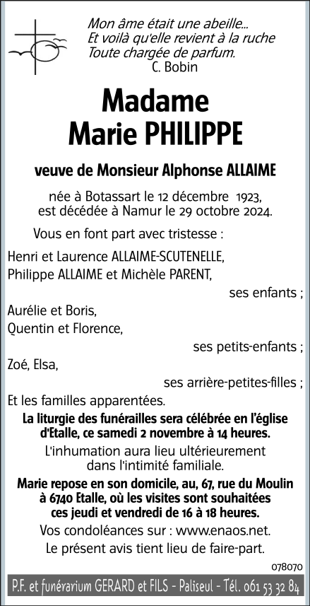 Décédée à Namur (5000) le jeudi 31 octobre 2024 à l'âge de 100 ans