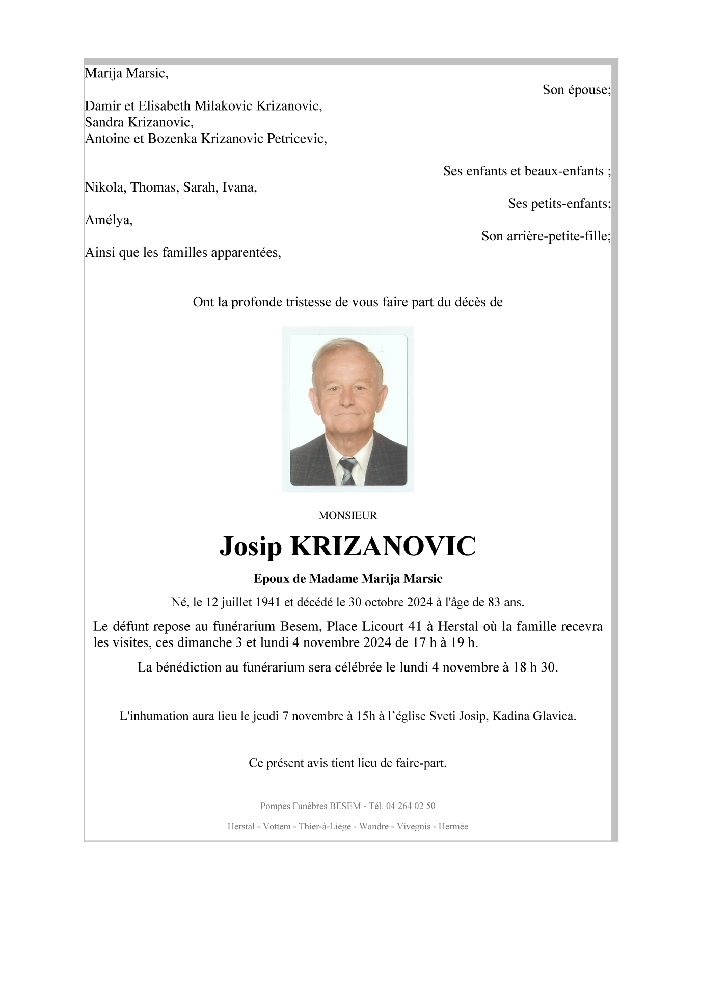 Décédé à Herstal (4040) le mercredi 30 octobre 2024 à l'âge de 83 ans
