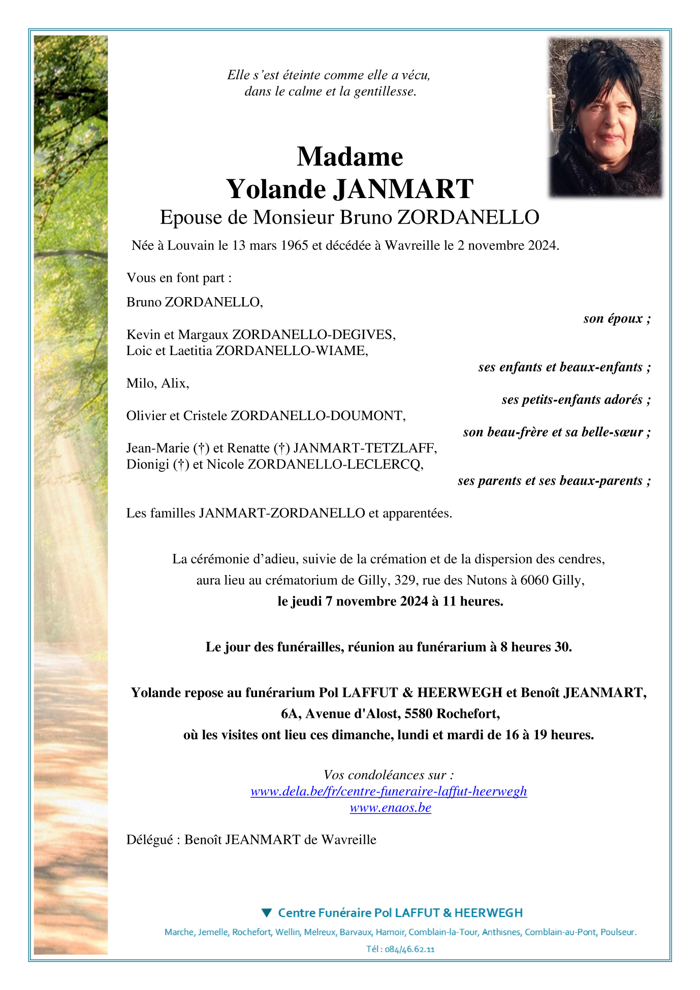 Décédée à Wavreille (5580) le samedi 2 novembre 2024 à l'âge de 59 ans
