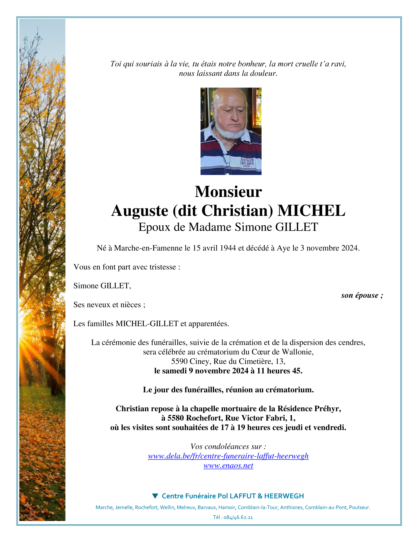 Décédé à Aye (6900) le dimanche 3 novembre 2024 à l'âge de 80 ans