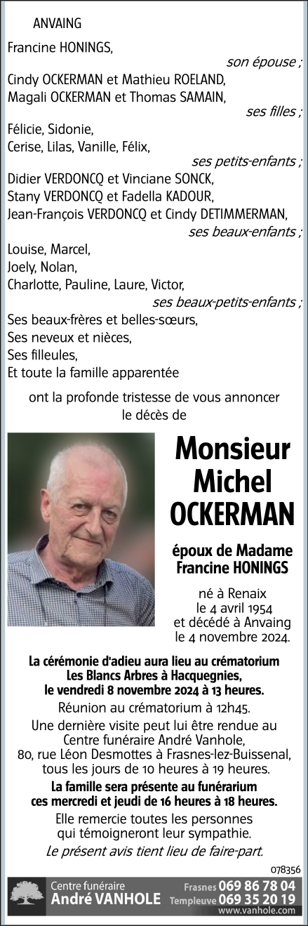 Décédé à Anvaing (7910) le lundi 4 novembre 2024 à l'âge de 70 ans