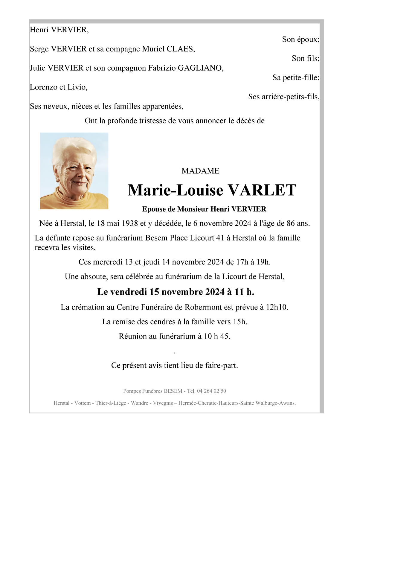 Epouse de Monsieur Henri VERVIER