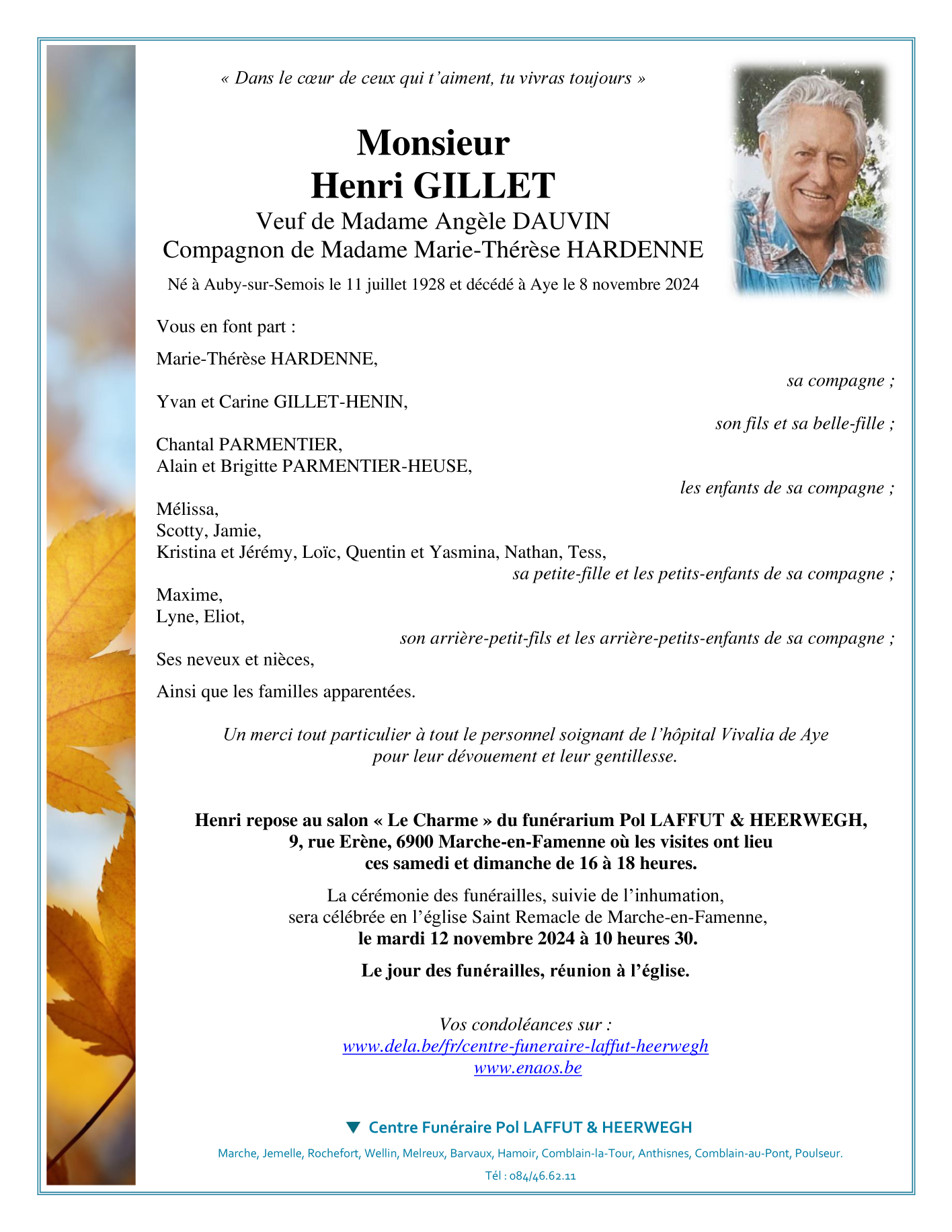 Fallecido en Aye (6900) el viernes, 8 de noviembre de 2024 a la edad de 96 años
