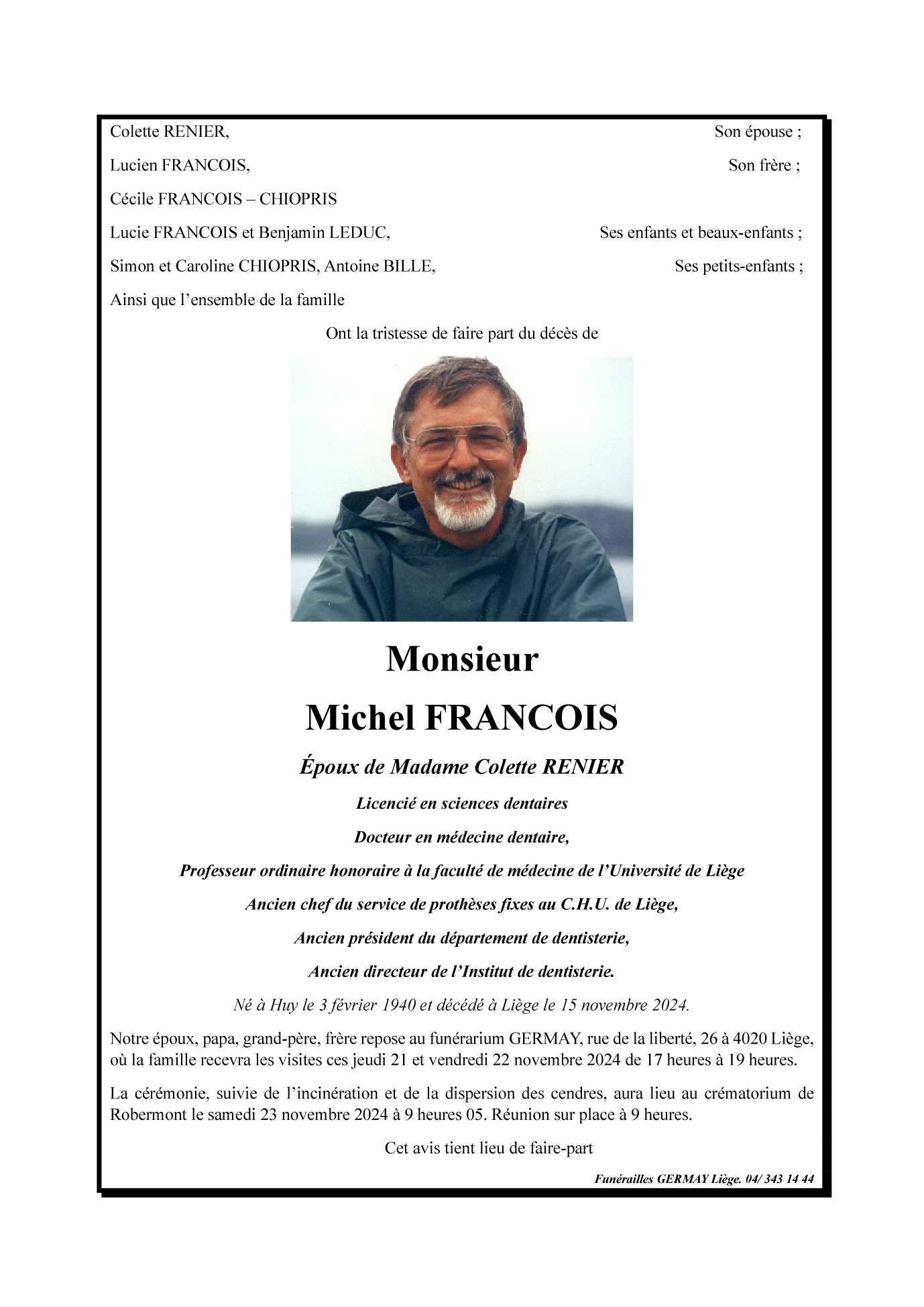 Décédé à Liège (4020) le vendredi 15 novembre 2024 à l'âge de 84 ans
