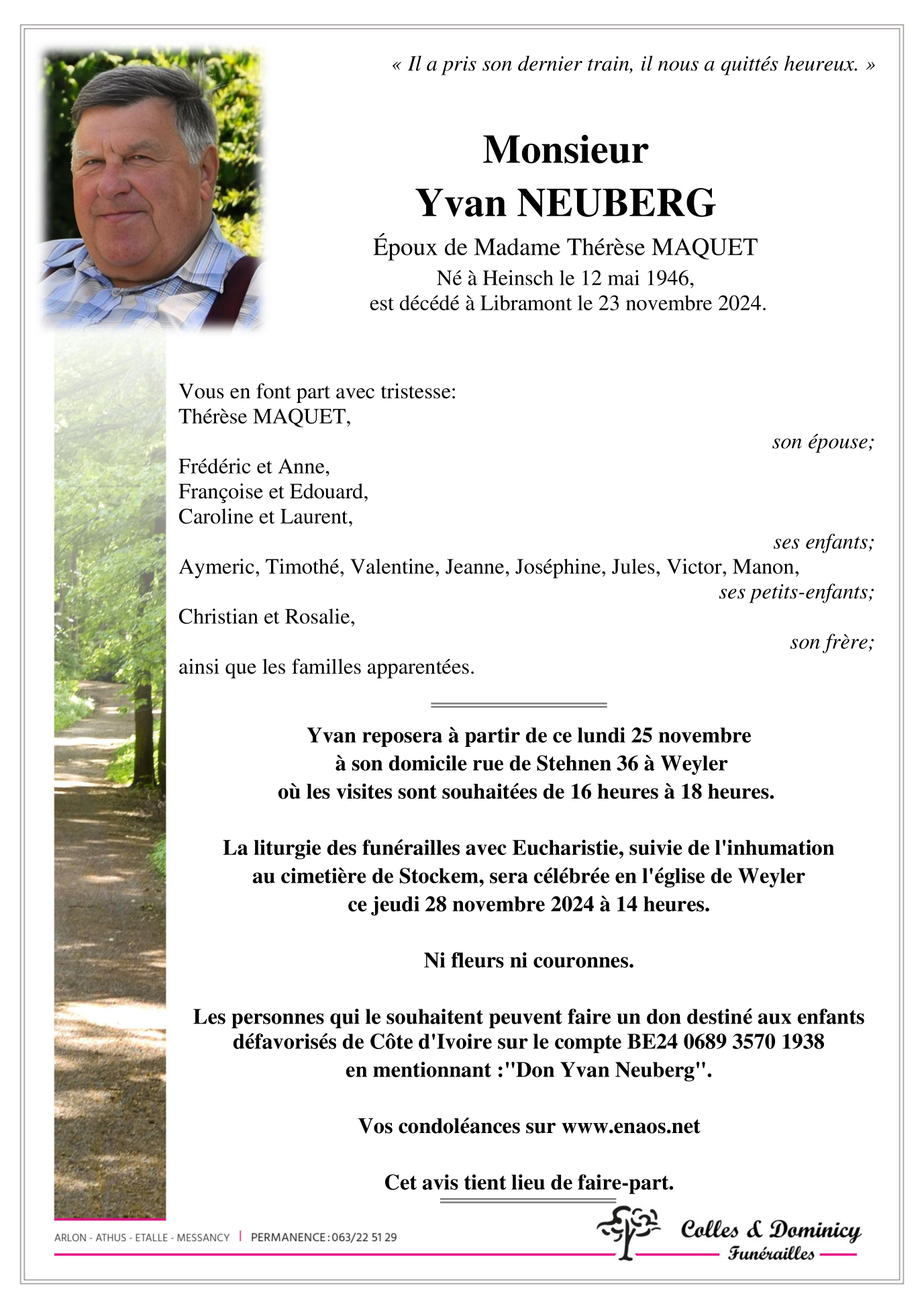 Décédé à Libramont-Chevigny (6800) le samedi 23 novembre 2024 à l'âge de 78 ans