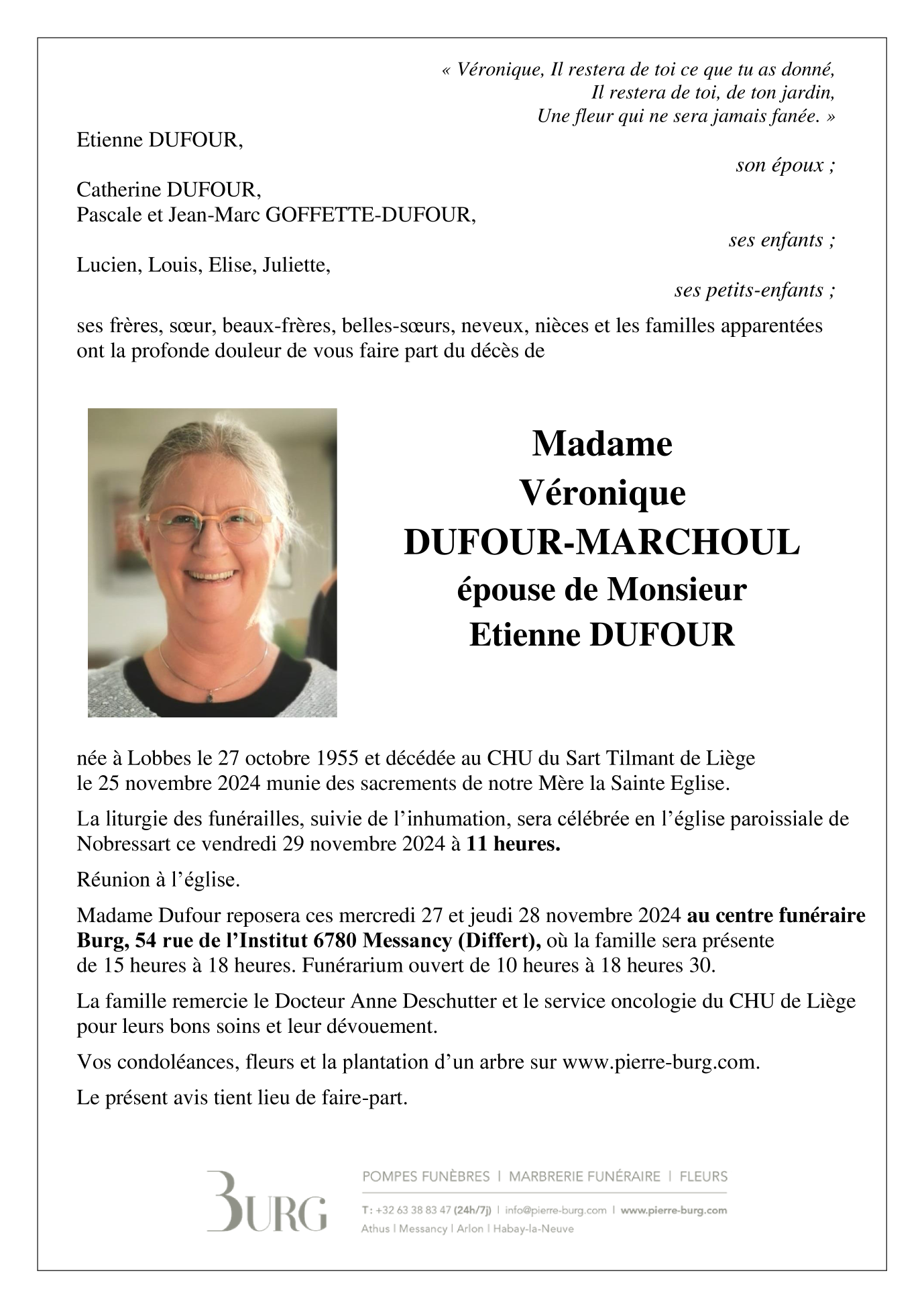 Décédée à Liège (4000) le lundi 25 novembre 2024 à l'âge de 69 ans