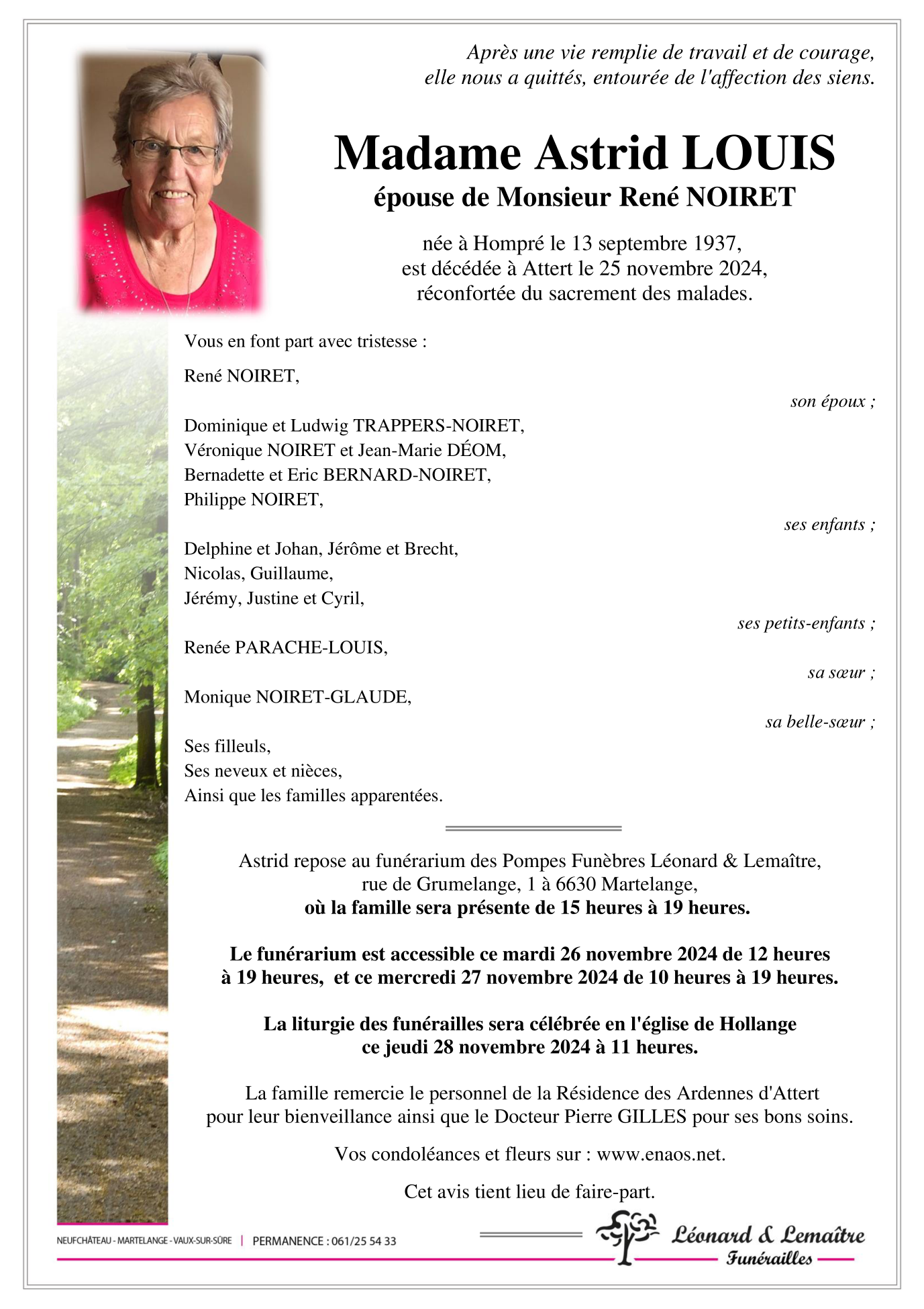 Décédée à Attert (6717) le lundi 25 novembre 2024 à l'âge de 87 ans