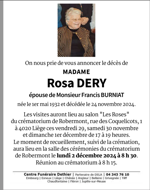 Décédée à Jupille-sur-Meuse (4020) le dimanche 24 novembre 2024 à l'âge de 92 ans