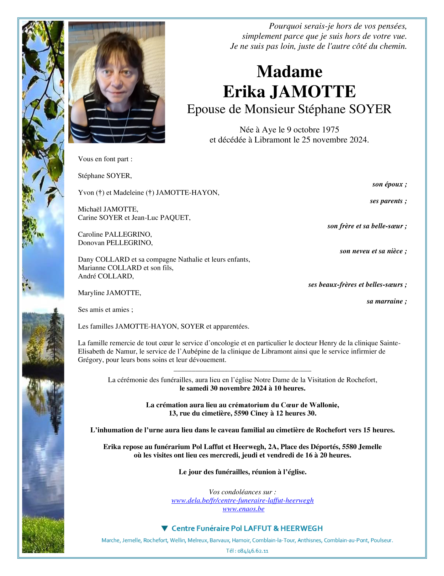 Décédée à Libramont (6800) le lundi 25 novembre 2024 à l'âge de 49 ans