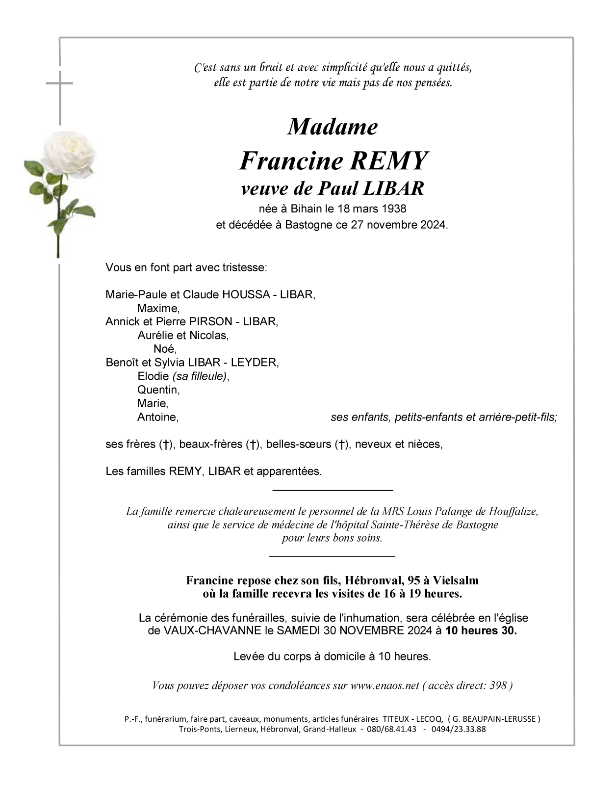 Décédée à Bastogne (6600) le mercredi 27 novembre 2024 à l'âge de 86 ans