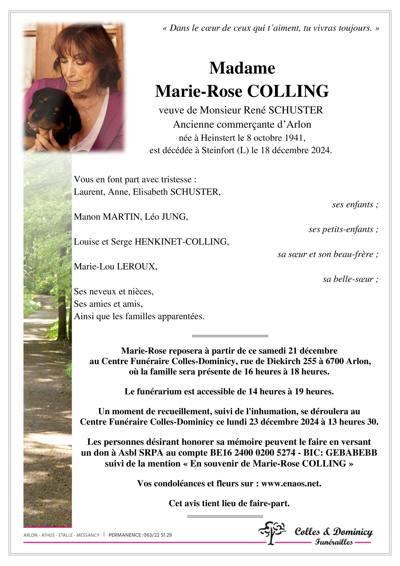 Décédée à Steinfort/Hopital  (8423, Luxembourg) le mercredi 18 décembre 2024 à l'âge de 83 ans