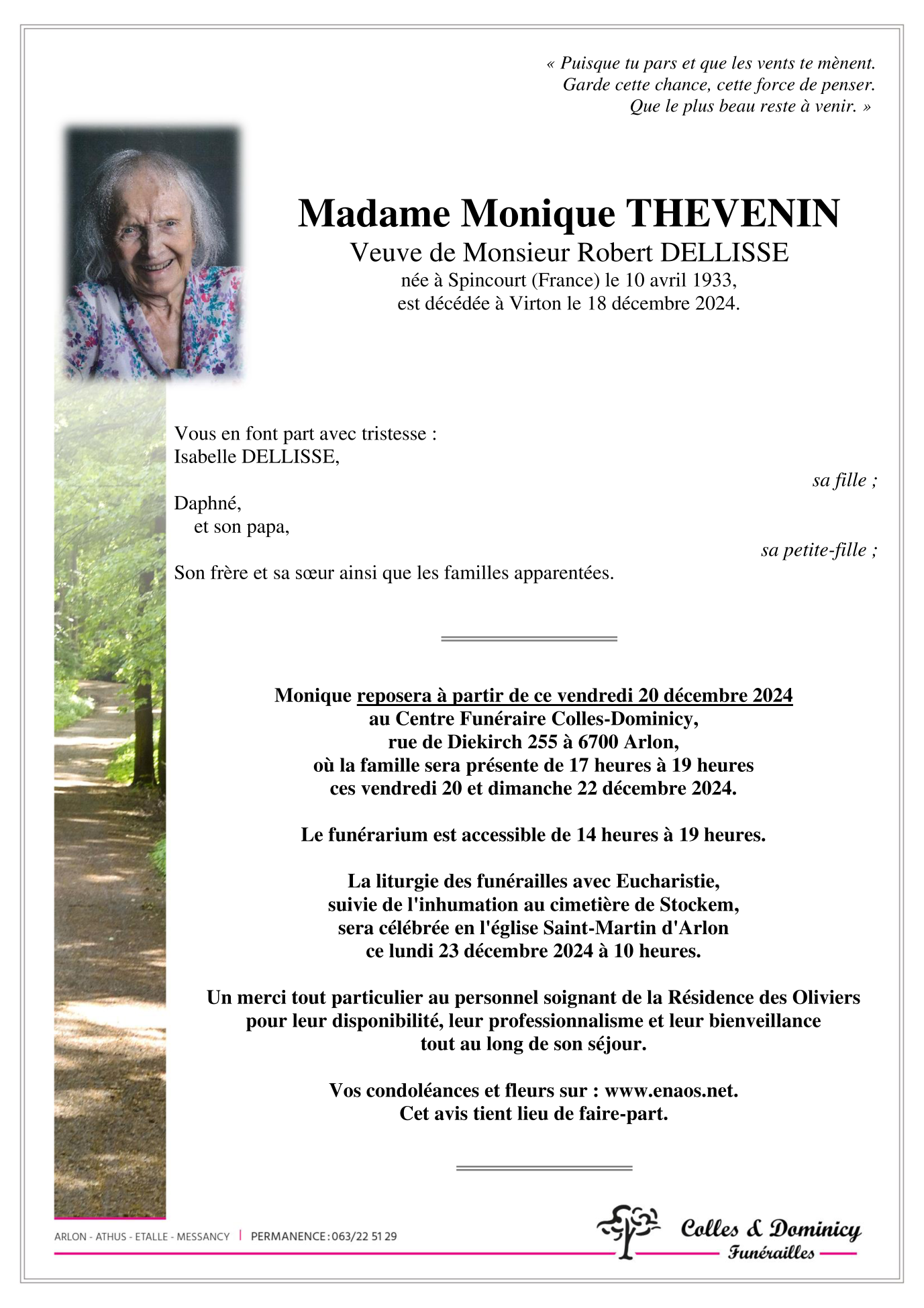 Décédée à Virton (6760) le mercredi 18 décembre 2024 à l'âge de 91 ans